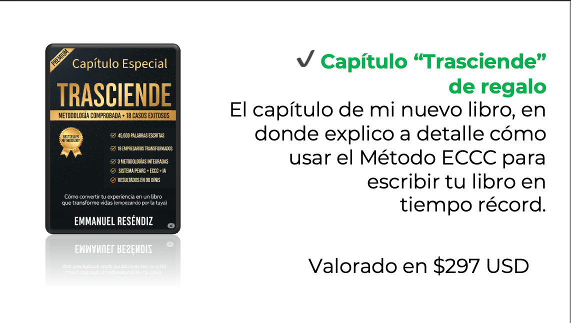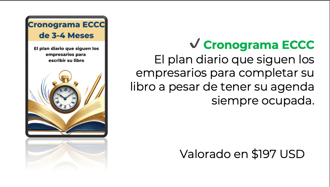 En Solo 90 Minutos, Domina el Método ECCC que más de 12 Empresarios han Usado para Transformar su Historia en un Libro que Ahora es su Legado al Mundo.